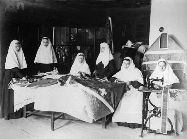 О том, как в старом Дивееве было организовано швейное послушание, мы можем судить по фотографиям и немногим воспоминаниям. В воспоминаниях монахини Серафимы (Булгаковой), в частности, сказано: «В рукодельном послушании шили гладью на пяльцах и вообще вышивали. В портной шили одежду для сестер. Портных было несколько. В ризной шили и чинили ризы, делали цветы, убирали иконы и плели русское кружево на коклюшках. В вязальном вязали на машинах. В манатейном пряли из русской овечьей шерсти и ткали манатею, из которой шили ряски и мантии. Специальные сестры шили апостольники и камилавки».