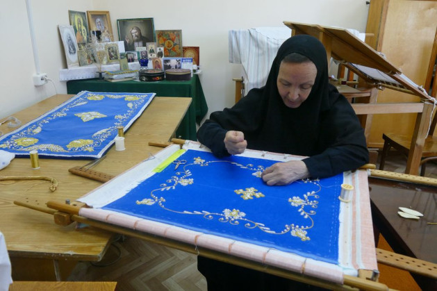 Есть в швейной небольшое вышивальное дело, где занимаются вышиванием икон, покровцов на святые мощи. Это кропотливая и тонкая работа, на один образ уходит несколько месяцев. Для примера, обычную нить для вышивания расщепляют надвое, чтобы вышивка была без пробелов. Так как покровцы требуют особого ухода, то следит за ними сестра, которая их и вышивает. Мало вышить рисунок, надо его еще умело проклеить и сохранить после стирок и чисток в первоначальном виде.