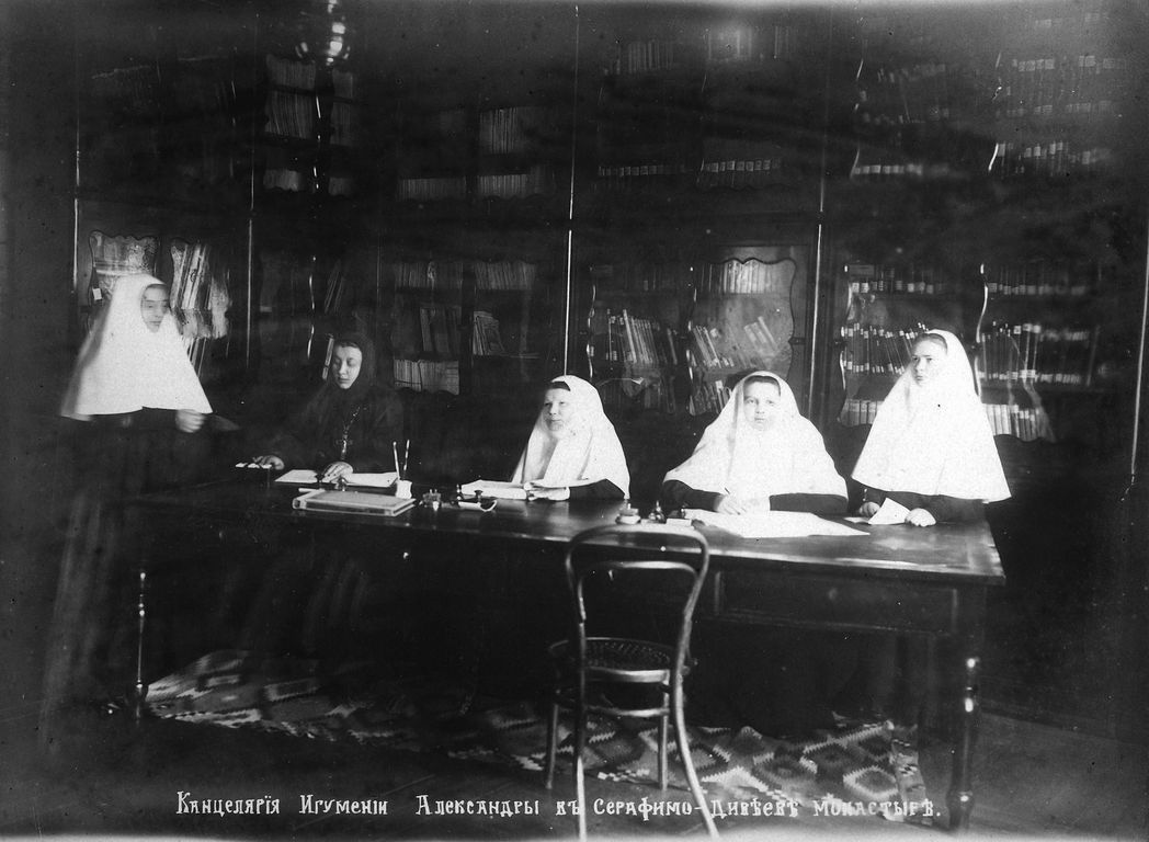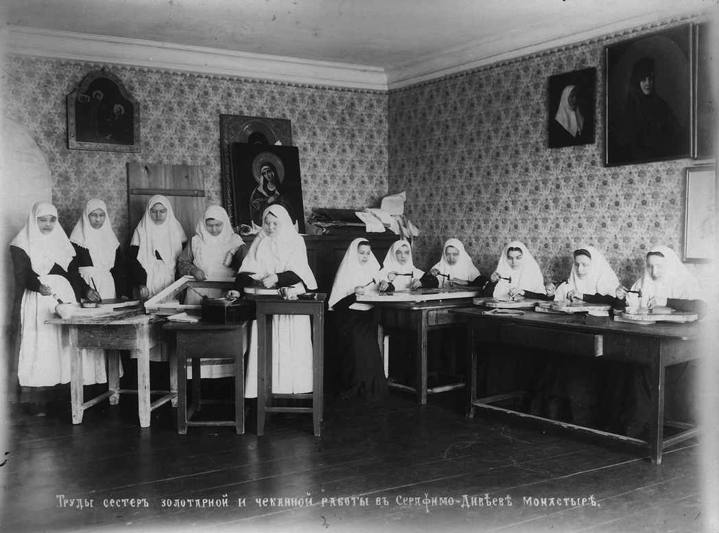О том, как был организован труд в живописной мастерской, вспоминала монахиня Серафима (Булгакова): «Сестры жили по послушаниям. В корпусах обычно находились мастерские и жилые келии. Кто где работал, там и жил. В монастыре была большая живописная мастерская. В ней сестры не только писали иконы, но и заготовляли доски, золотили и чеканили. У каждой была своя специальность. В последнее время создали отдельную иконописную. Больше 80 сестер жили и работали в литографии. Сами работали на камнях (накалывали), по году подготовляли каждый камень. Печатали на моторе картины. Кроме того, переводили картины на белые грунтованные доски и затем их прописывали. Отливали из алебастра фигуры преподобного с медведем и раскрашивали. Делали всякие корзиночки, игрушки. Все это раздавали и продавали в монастырской лавке».