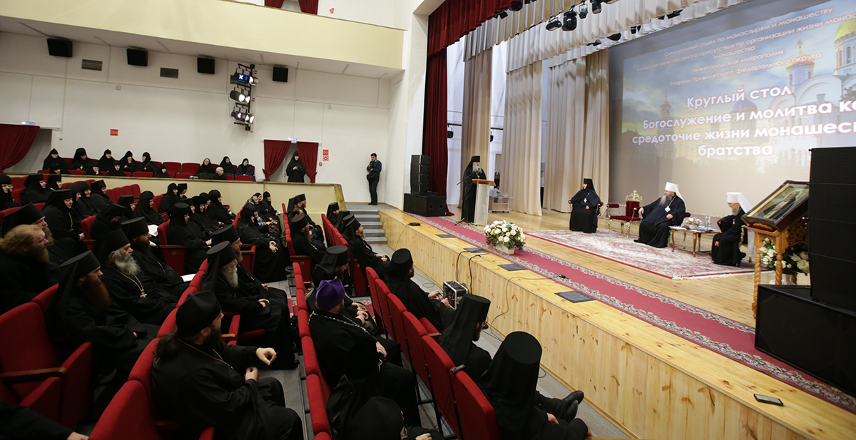 Накануне, как сообщал портал «Монастырский вестник», состоялся круглый стол, в рамках которого участники встречи обсудили практические аспекты и особенности монастырского богослужения. Во второй части заседания в формате дискуссии с сообщениями на заявленные темы выступили игумен Нижегородского Благовещенского монастыря, ответственный по мужским монастырям Нижегородской епархии архимандрит Александр (Лукин) («Современные практики совершения суточного богослужебного круга и Литургии») и насельник Нижегородского Вознесенского Печерского монастыря игумен Вассиан (Бирагов) («Значение келейного правила для духовного делания, подготавливающего к участию в богослужении, и как части богослужебного круга»). Во время обсуждения этих выступлений были высказаны, в частности, мысли о богослужении в монастыре как главном объединяющем начале и фундаменте, на котором строится монашеское общежитие, о молитве как источнике жизни и здоровья души (именно поэтому в уставе монастыря должно быть предусмотрено время для келейной молитвы), о высоте монашеского целеполагания – святости, а также о том, что глубинная суть келейной и церковной молитвы не меняется от места ее совершения и в келии подвижник приносит на алтарь свое сердце.