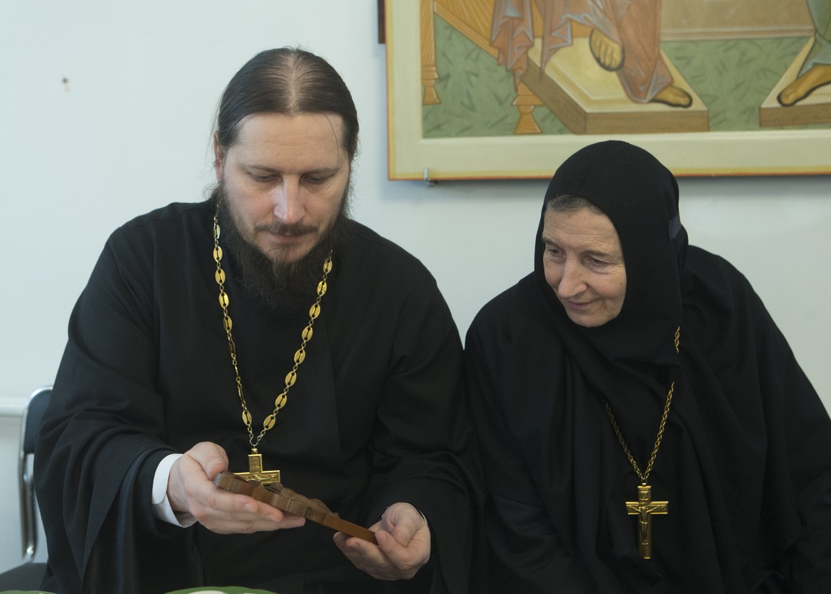 8 февраля, в день первой в скиту Божественной литургии, совершенной в честь новопрославленной преподобноисповедницы Фамари было немало запоминающихся моментов. Один из них – дарение резного деревянного креста, принадлежавшего священномученику Серафиму (Звездинскому). Сын и дочь приснопамятного протоиерея Бориса Гузнякова (его представители старшего поколения верующих москвичей помнят по служению в храме «Всех скорбящих Радость» на Большой Ордынке) передали эту святую реликвию в вашу обитель. Им она досталась от отца, который, служа когда-то в подмосковном Дмитрове, стал духовником схимонахини Иоанны (Патрикееевой) – келейницы священномученика Серафима (Звездинского) – и оставался им до последнего ее вздоха.