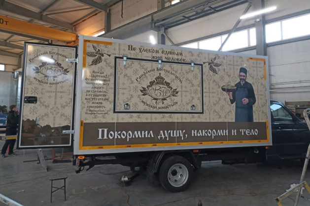 Образ монастырского повара мы нашли в Интернете. Удачный, думаю, образ, который – я полностью согласен – задает настрой. Судя по всему, это монах-афонец. Мне довелось бывать на Святой Горе Афон, и я видел, как братия готовит к престольным праздникам угощение в больших чанах. Также мы изобразили на вагончике эмблемы Раифского монастыря и написали слова преподобного Серафима Саровского: «Всегда радуйтесь! От внутренней натуги ничего доброго не сделаешь, от радости – что угодно можно совершить». Кроме этого, написали слова, известные многим людям: «Не хлебом единым жив человек...» Что дальше следует, истинные христиане знают.