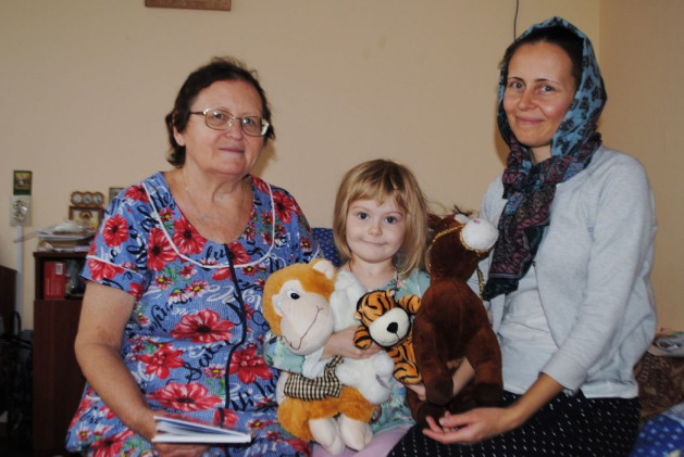 Очень интересная история произошла в сентябре этого года, когда нам позвонила директор Ростовского дома-интерната для пожилых людей и инвалидов и высказала пожелание своих подопечных поздравить детей из нашего приюта с началом учебного года. Гости солидного возраста вручили всем деткам сладкие подарки, фрукты, игрушки, но особенно трогательно было получить из рук бабушек и дедушек подарки, сделанные теми собственноручно: вышитую бисером икону, нарисованные – красивые! – картины, вязанные шерстяные носочки и тапочки. Такую помощь мамы с детьми принимали со слезами на глазах. Подарки подарками, а встреча разных поколений сопровождалась и другим: рассказами пожилых гостей историй из своей жизни, играми с детьми, чтением стихов и наконец приглашением детей в дом-интернат на новогодний праздник-спектакль.