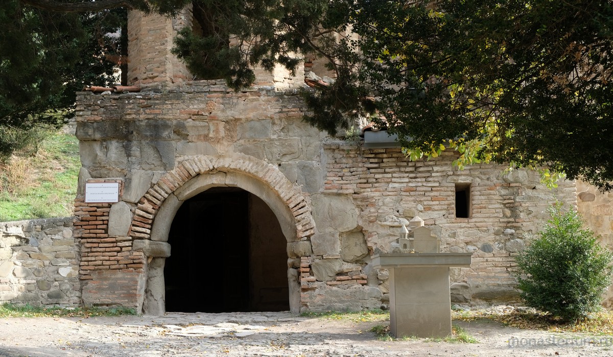 Предание говорит, что при преподобном были построены три храма: Иоанна Предтечи, Пресвятой Богородицы и Пресвятой Троицы. Там, где могила преподобного, храм VI века. А храм Пресвятой Богородицы, где мы сейчас беседуем, XII века, построил грузинский царь Давид IV Строитель. Рассказывают, что храм построен на основании старой церкви, которая была во времена преподобного. Его несколько раз разрушали, особенно в нашествие персидского шаха Аббаса I. В конце XIX – начале XX века этот монастырь восстановил епископ Гурийско-Мингрельский Александр (Окропиридзе). Сейчас он прославлен в лике святых, погребен тоже в нашем монастыре. Он очень благодетельствовал монастырю, при нем сделана роспись стен – русским мастером Андреевым.