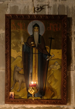 Преподобный Шио творил много чудес, и многие люди приходили к нему для исцеления. Но в лесу на них часто нападали дикие звери, поэтому преподобный призвал однажды всех хищных животных, которые были в этой местности, и велел им уйти. Оставил только одного волка, чтобы он пас монастырское стадо ослов. Этот волк изображен рядом с ним на иконах. И, обратите внимание: святой кадил голой рукой, на иконе он держит уголь на руке, и так кадит. (По преданию, кадильный дым указал ему место постройки монастыря.)
