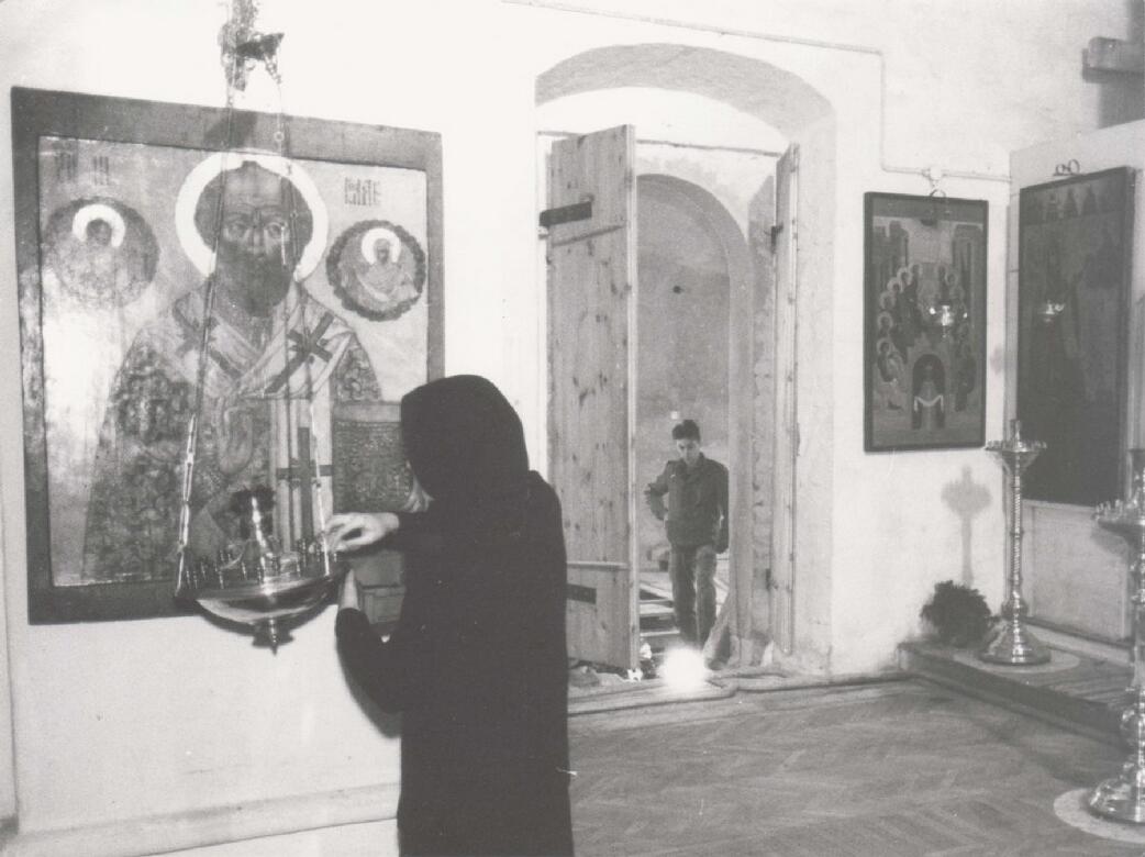 Монастырская территория была занята различными организациями и заселена жильцами. Храмы и здания разрушались от самого основания. Когда мы приехали в еще не утвержденный официально монастырь, нас никто не ждал, если не сказать обратного. Знакомых в Москве у нас не было, а на месте будущей обители нас встретили отнюдь не дружелюбно, что, конечно, объяснимо. После долгих поисков жилья, отказов, «пророчеств» в том духе, что «монастыря здесь никогда не будет», нам дали возможность разместиться в маленькой комнатке рядом с кафе. Если рассуждать по-человечески, нереально устраивать монастырь без средств, на месте, где в буквальном смысле негде приклонить голову. Но эти трудности не были главными: постепенно, с Божией помощью, ситуация разрешилась. Более сложным представлялось наладить внутреннюю жизнь обители. Пришедшие в монастырь первые насельницы плохо понимали, что такое монашество, духовная жизнь, какова цель жизни вообще. Однако они стремились к добру, и это стремление необходимо было развивать. И наши духовные наставники, имея доверие Богу, умели видеть образ Божий и все лучшее в человеке. Для Святейшего Патриарха Алексия, протоиерея Бориса Николаева и всех наставников, которых посылал и посылает нам Господь, не существовало слов «не могу» и «невозможно». Они молились и действовали с надеждой на помощь Божию, которая приходила по их молитвам.