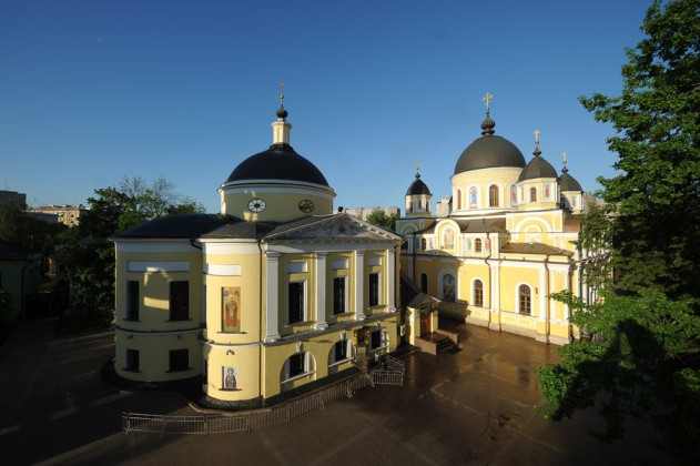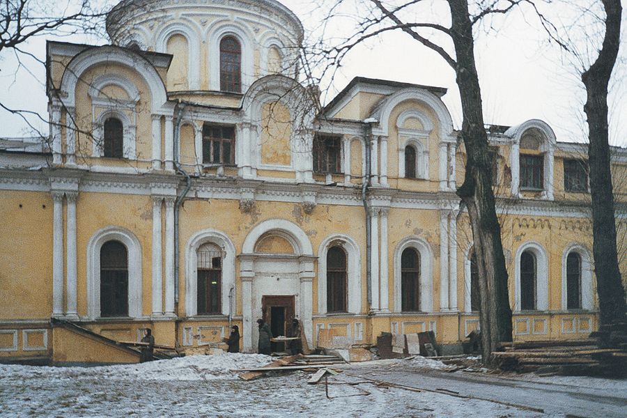 Впервые я приехала сюда в марте, это было начало Великого поста. Начало весны, слякоть, снег таял – конечно, ужасный вид. Может быть, если бы мое «знакомство» с обителью произошло летом, то зеленая травка и деревья скрасили бы то тягостное впечатление, которое было от обезображенного монастыря. Куполов на храмах не было, на крышах росли деревья и трава, не знаю во сколько слоев… Правда, что меня порадовало – на территории не было возведено никаких лишних строений, оставались только церковные здания. Хотя они были совершенно бездарно перепланированы под нужды десятков арендаторов. В Воскресенском храме было три этажа: на первом этаже спортзал, какие-то тренажеры, ночной клуб; в подвале – бильярдная, наверху, где сейчас ризница, – киностудия, часть помещений арендовали экстрасенсы и еще какие-то фирмы и организации…