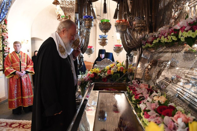 Мы заранее готовим дорожку, украшенную живыми цветами, вдоль которой выстраиваются паломники, и каждый хочет быть поближе, чтобы увидеть и сфотографировать Первосвятителя, получить благословение Его Святейшества. Следуя в храм, Святейший Патриарх Кирилл всегда благословляет прихожан, поздравляет их с праздником. За богослужением большинство паломников наблюдают по большому экрану, установленному на монастырской площади, т.к. наш большой Воскресенский собор не вмещает всех молящихся.