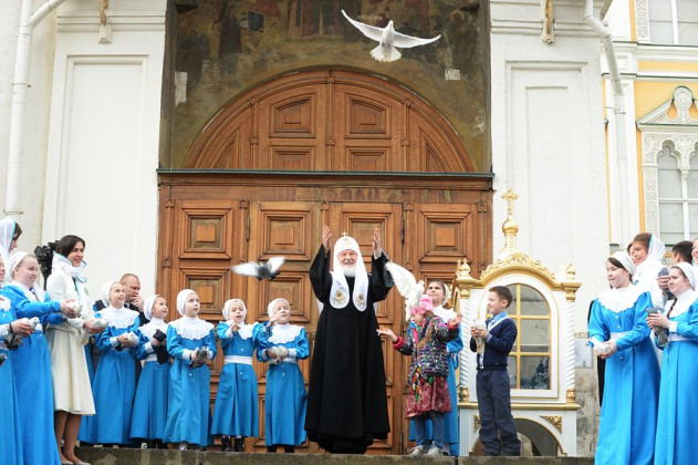 Также Предстоятель вместе с детьми Покровской обители выпускает голубей в праздник Благовещения Пресвятой Богородицы в Кремле.
