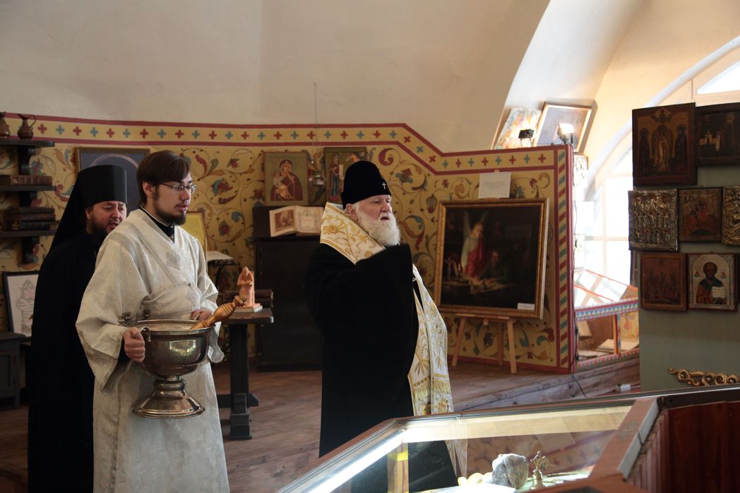 В историческом помещении музея-ризницы, который существовал еще в первой половине XIX века. Храм, где находится это помещение, освящен в 1836 году во имя святителя Иакова Ростовского – основателя нашего монастыря. Чин освящения совершил святитель Филарет (Дроздов), митрополит Московский. Сохранился даже текст его проповеди, произнесенной в день памяти святителя Иакова. Митрополит Филарет и стал первым посетителем музея-ризницы.
