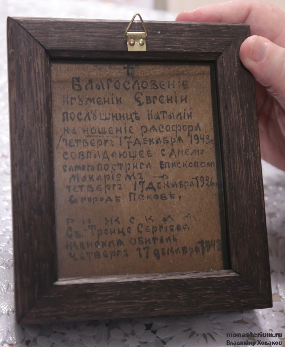 Есть и мысль, и желание. Думаю, с данным вопросом нам следует обратиться к Михаилу Александровичу Гольдфельду, генеральному директору издательства «Правило веры», известного своей бережной и тщательной подготовкой текстов к публикации. Это – на перспективу. Сейчас же хочу поведать еще об одном дорогом сердцу напоминании о Свято-Троице-Сергиевой обители в Риге. Как-то ко мне пришла одна муромчанка и сказала: «Матушка, вы вроде из Риги? Вот я на рынке купила иконочку. Посмотрите на надпись с обратной стороны». Я посмотрела вначале на саму иконку: это был наш образ преподобного Сергия, рижский! Стала читать надпись на обратной стороне и, прямо говоря, испытала шок, увидев, что это письменное благословение игумении Евгении послушнице Наталии на ношение рясофора в четверг 17 декабря 1943 года, совпадающее с днем самого пострига епископом Макарием в четверг 17 декабря 1926 года в городе Пскове. Схиигумения Евгения (Постовская) управляла Рижской обителью с 1921 по 1947 годы. Владыка Макарий (Звездов) в 1926 году был викарием Псковской епархии. Как все факты соединить воедино? Мне удалось «выйти на след»: владыка постригал послушницу Наталию в Пскове, которая потом, спустя годы, пополнила монашескую семью Рижской обители. Причем я ее не просто знала. Для меня она, впоследствии монахиня  Сергия (Петрова), стала, можно сказать, духовной старицей. Но все же каким образом небольшая иконка с благословением игумении Евгении попала на Владимирскую землю? Оказывается, мать Сергия с другой рижской сестрой приезжала в Муром и, видимо, дала кому-то свою иконочку. Мне в этом видится Промысл Божий: икона преподобного Сергия Радонежского для меня словно дорогая «весточка» из родного монастыря в Риге. Она не только напоминает о нем, но и придает сил.