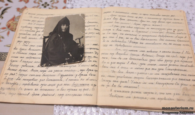 Конечно, в первую очередь молитва. Молитвенная поддержка сестер, прихожан, владыки Евлогия помогли полюбить эту землю знакомство с ее историей, святыни Владимирской земли в целом, святыни монастыря, а еще – некоторые реликвии, Промыслом Божиим оказавшиеся у меня. Они прочно соединили меня с Муромом, породнили с ним. Одну из них я сейчас покажу, можете ее сфотографировать. Это дневник игумении Евфросинии (Арсеньевой), которая была связана с сестрами Мансуровыми, Екатериной и Наталией, фрейлинами Высочайшего двора, основавшими Свято-Троице-Сергиеву обитель в Латвии. Что же касается матушки Евфросинии, дочери известного либерального деятеля – крупного юриста и литературного критика, то она по благословению отца Иоанна Кронштадтского основала в своем имении в Петербургской губернии (станция Плюсса) Воскресенско-Покровскую женскую монашескую общину. Устав, форму для сестер матушка взяла у своих землячек – сестер Мансуровых, уже в то время подвизавшихся в Риге. Кроме того, в помощь новоначальным сестрам из Рижского монастыря на три месяца в Плюссу были присланы три монахини: регент, церковница и трапезница. Они обучали сестер церковному пению и чтению, выпечке просфор. Так что, как видите, между Ригой и Санкт-Петербургом в этом плане очень тесная связь. Но прослеживается  и духовная связь с Муромом, куда после закрытия общины в советское время переселилась матушка Евфросиния. В то время правящим архиереем здесь был архиепископ Макарий (Звездов), позже арестованный и в октябре репрессивного 1937 года постановлением Тройки УНКВД Свердловской области приговоренный к высшей мере наказания. А матушку Евфросинию, проходившую в Муроме «по групповому делу» и обвинявшуюся в создании здесь подпольного антисоветского женского монастыря, в распространении клеветнических слухов о новой власти, ведении пораженческой агитации и прочих «грехах», отправили в ссылку в город Горький (Нижний Новгород). Пробыла она там несколько месяцев. В ноябре 37-го ее расстреляли...  Мне этот дневник и фотографию игумении Евфросинии передала одна здешняя монахиня. Я открываю его, листаю пожелтевшие от времени страницы, исписанные красивым каллиграфическим почерком, читаю: «Вот страшно стало: не постигло бы нас изгнание из обители за грехи наши. Горе нам будет тогда и плач великий...» Это было написано еще в Плюссе. Затем –уже из ссылки она обращается к сестрам: «С чего должна начать сегодня? Сегодня должна начать с глубокого искреннего горячего прощения с забвением полным всех прежних обид друг на друга. Надо нам научиться просить прощения друг у друга, но для этого надо уметь первей всего просить у Господа – быстро, лишь только закрадется в душу нашу что-то недоброе». Знакомясь с этим дневником, я не раз думала: нет, не смогла бы я так красиво (почерк!) и мудро (духовная суть) писать: нет у меня такого воспитания и образования, которое было у матушки-аристократки Евфросинии. Но читать ее дневниковые записи тех лет, опаленных огнем революции и репрессий, сверять свою жизнь с ее высокими требованиями к духовному возрастанию на монашеском пути мы можем.