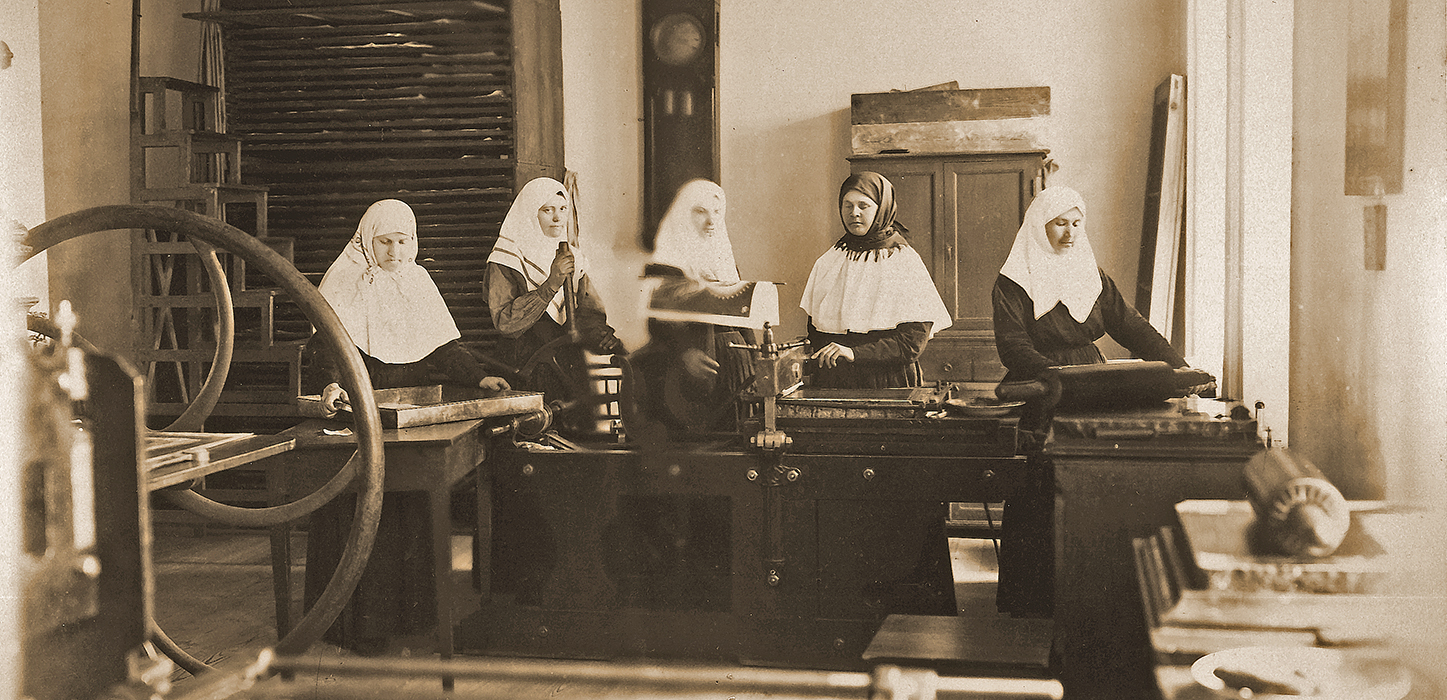В старом Свято-Троицком Серафимо-Дивеевском монастыре издательского послушания не было. Была литография, в которой более 80 сестер на больших по размеру и тяжелых по весу камнях иголками накалывали изображения – в основном иконы батюшки Серафима и Божией Матери «Умиление». Каждый камень подготавливали в течение года, затем печатали на печатных машинах и сушили картины. В 1903 году монастырскую литографию посетила Царская чета. Большое впечатление на Высоких гостей произвела скоропечатная машина. Царица Александра Федоровна тогда сказала: «Вам еще много понадобится!», очевидно имея в виду технические средства. Действительно, понадобилось многое, только уже в конце XX – начале XXI века. В возрожденном монастыре приобрели ризограф и с него начали типографскую деятельность. Позже игумения Сергия (Конкова) твердо переименовала это послушание из типографского в издательское. Об основных направлениях монастырского издательства нам рассказала монахиня Макария (Огудина).
