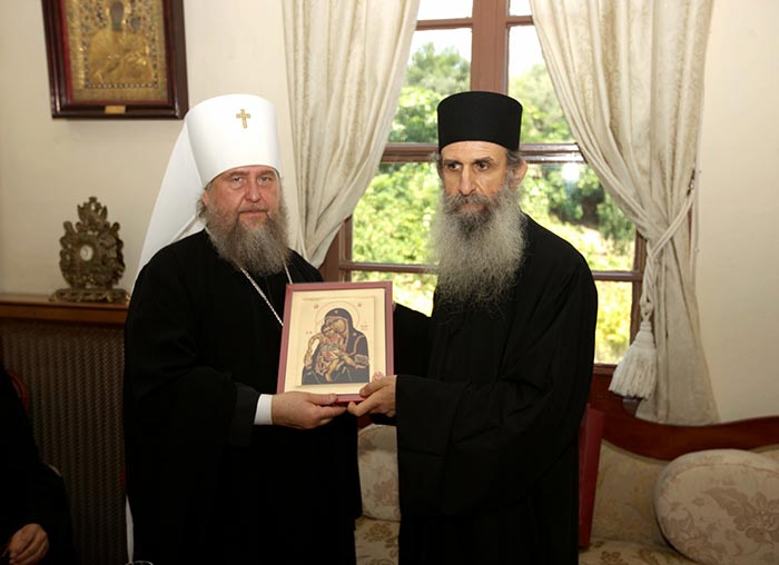 В Русском на Афоне Пантелеимоновом монастыре вековая историческая связь со Святой Русью, императорской Россией и современным Русским миром ощущается особо. И дело не только в количестве даров от русских царей, князей или именитых граждан. Святые образа, написанные во Владимире или Ярославле, созданные придворными императорскими мастерами или выполненные в Палехе и Мстере на щедрые купеческие пожертвования, сосуды, утварь, облачения из России в изобилии украшают фактически все афонские монастыри. Так в алтаре соборного храма монастыря Ватопед члены делегации увидели прекрасно написанный старинный Феодоровский образ Пресвятой Богородицы в драгоценной ризе. Мне довелось более двадцати лет быть хранителем явленной чудотворной Феодоровской иконы в городе Костроме, и всегда душевную радость доставляет мне возможность увидеть списки с этой святыни в разных храмах и монастырях православного мира. На мой вопрос, не является ли эта икона царским подарком, как покровительствующая Дому Романовых, сопровождавший нас монах дал утвердительный ответ.