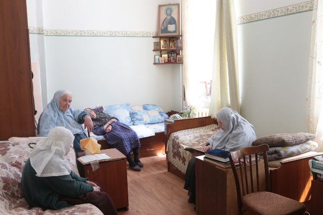 ...Жизнь обитательниц богадельни протекает спокойно, размеренно. Утром – Божественная литургия в храме преподобного Амвросия Оптинского или в домовом храме «Утоли моя печали». Затем трапеза в богадельне, во время которой, как и положено в монастырях, читается житие кого-то из святых. После трапезы отдых, после отдыха – посильный труд, о чем уже говорилось (чистка овощей, резка зелени для стола). Снова отдых и вычитывание молитвенного правила. В теплую пору года – прогулки на свежем воздухе, пешком или на инвалидной коляске. Кого нужно помыть, переодеть, хожалка все сделает. Кому нужна медицинская помощь, – пожалуйста, своя монастырская больница имеется, как и в дореволюционной обители, со стационаром и амбулаторией.