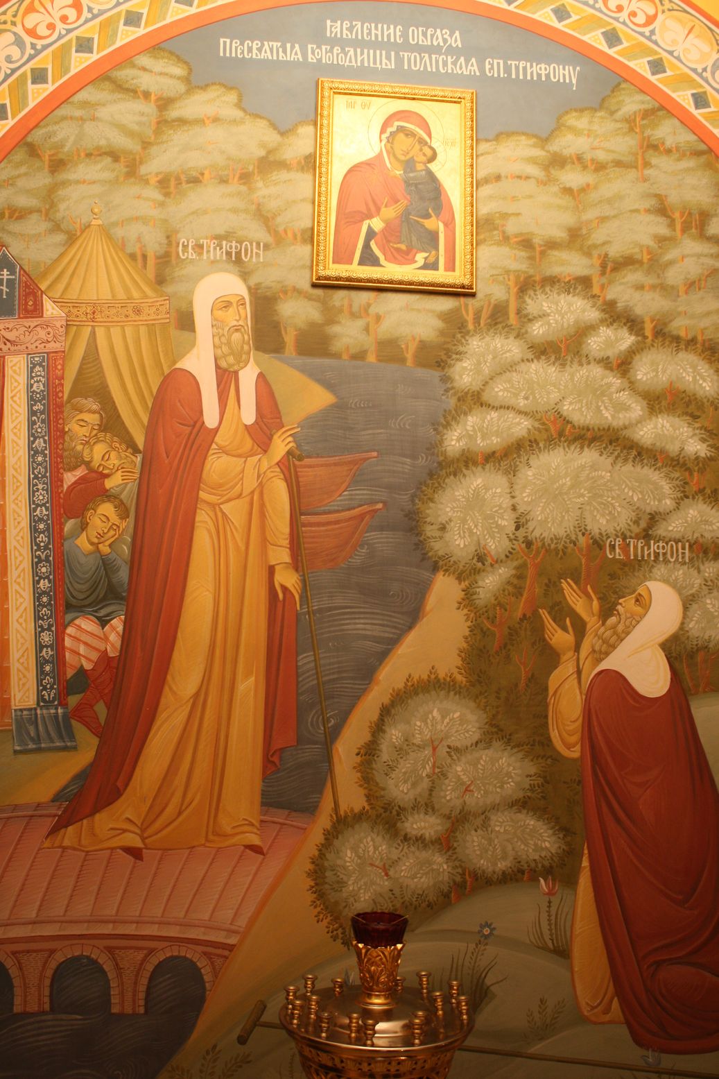 – А дальше, – рассказывает монахиня Смарагда, – в один день была устроена обитель. Сразу был назначен игумен монастыря, а сам епископ Трифон, вдохновленный небесным знамением, взялся за топор: сам стал рубить бревна и с помощью своих спутников и ярославских горожан за день выстроил «обыденный» храм. Владыка освятил его в честь праздника Введение во храм Пресвятой Богородицы и благоговейно внес икону Матери Божией. Явленная чудесным образом икона получила название Толгская – по имени протекающей неподалеку маленькой речушки Толги.