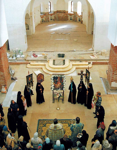 Каждое событие монастырской жизни было свидетельством явного заступничества и попечения Царицы Небесной. Особенно ясно это чувствовалось в том, как происходило воссоздание Собора Рождества Пресвятой Богородицы, полностью разрушенного в 30-е годы прошлого столетия. Вывод школы с территории монастыря, разбор здания, археологические и другие изыскания, проект Собора, закладка камня, возведение стен и куполов, Великое освящение одновременно семи престолов Собора – все было одним нескончаемым чудом, делом не столько рук человеческих, сколько благодатной помощи Пречистой Владычицы.