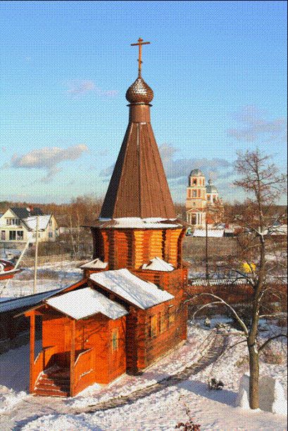 Спустя год на территории Подворья был построен деревянный храм в честь Успения Пресвятой Богородицы.
