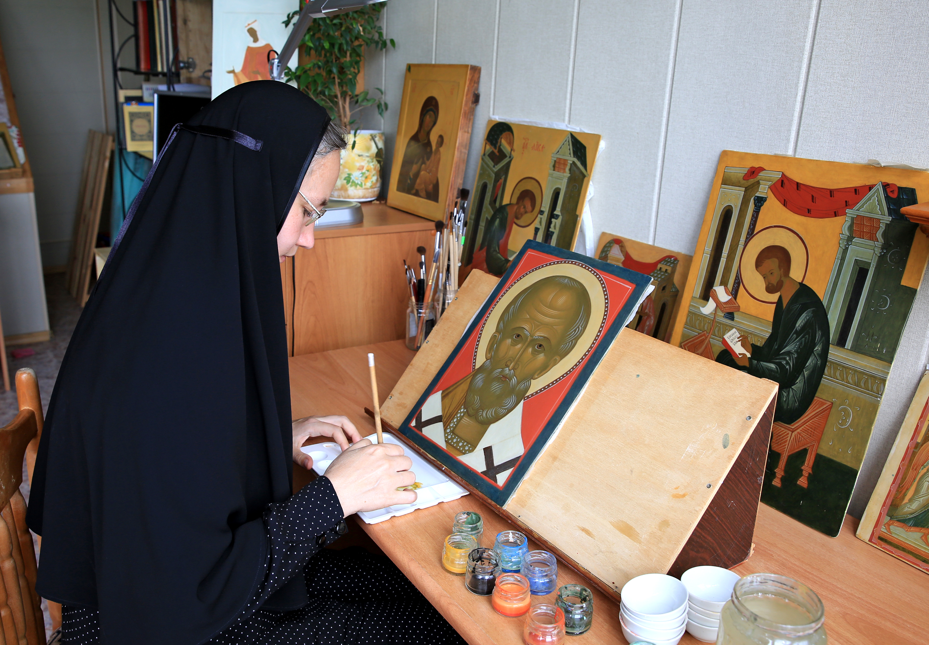 В 2008 и 2010 годах несколько сестер с отличием закончили обучение в Талдомском колледже декоративно-прикладного искусства и народных промыслов, где обучались рисунку, живописи и композиции, осваивали технику акварели. Неоднократно работы сестер монастыря выставлялись в Талдомском музее и колледже (ныне училище) ДПИ и НП. В качестве дипломных работ было решено начать создание декоративного оформления деревянно-керамического иконостаса в храме Божией Матери «Утоли моя печали» и мозаично-керамического иконостаса для домового храма святых мучениц Веры, Надежды, Любови и Софии.