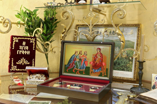 Рядом со святынями мы видим монашеское рукоделие, изделия народных промыслов, предметы раскопок, подарки и сувениры. Образ каждого удела венчает особенно почитаемая в нем икона Божией Матери.