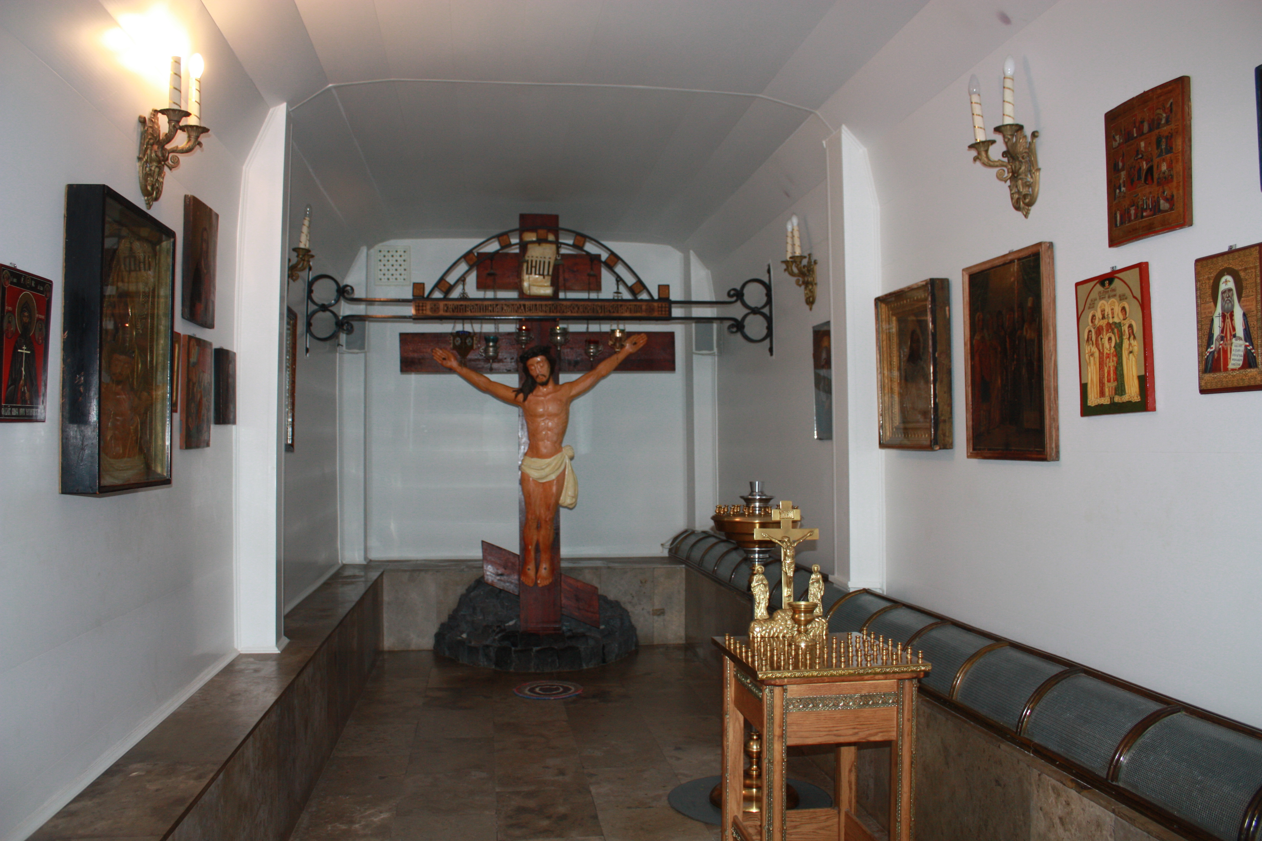 Еще одной чтимой святыней монастыря является кровоточивое Распятие Спасителя. Чудо произошло в 2000 году в праздник всех Святых, в земле Российской просиявших. Распятие тогда располагалось в небольшом надвратном Преображенском храме на колокольне. На глазах у паломников Распятие покрылось испариной и по волосам и из-под гвоздей выступили капельки крови. Позвали Настоятельницу и сестер. Капельки отерли платом, но кровь выступала снова. Распятие было перенесено в главный Троицкий храм для поклонения, а позже было установлено в специально устроенном для него приделе нижнего Успенского храма, который теперь называется Крестовым.