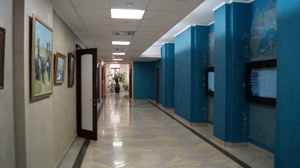 В коридоре на стенах — сенсорные панели. С их помощью каждый семинарист может найти необходимую ему информацию: расписание занятий и богослужений, сведения о преподавателях и выпускниках, историю монастыря и семинарии. А рамами для этих экранов служат орнаменты по мотивам византийских фресок.
