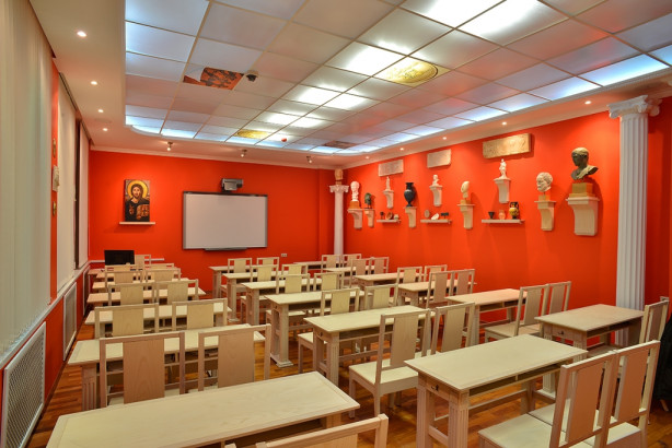 Аудиторию украшает русская иконография Ангелов кисти преподобного Андрея Рублева. А в углу аудитории — облицованная изразцами печь (стилизованная, конечно, но очень уютная).