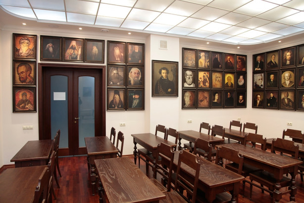 Копии балканских фресок встречают заходящих в аудиторию. Это не просто иконы, а шедевры иконографии, каждая деталь которых исполнена глубочайшего литургического и богословского смысла. Здесь же, в подлинниках, — дониконовский антиминс и епископское богослужебное облачение, принадлежавшее митрополиту Вениамину (Федченкову), писателю и подвижнику. Владыка известен своими литургическими трудами и трогательными, полными простоты и веры рассказами из его «Записок архиерея».