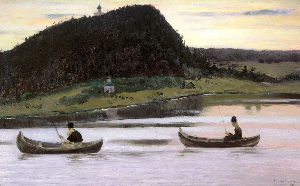 Изображение воды именно как Воды Живой прочитывается в работе Михаила Нестерова (1862–1942) «Молчание», написанной в 1903 году. В картине присутствует особый, спокойный молитвенный ритм: горизонталь – две лодочки с сидящими в них монахами, склоненными в одну сторону, и вертикаль – два храма. Храм на горе практически упирается в верхний край картины – достает до неба, но чтобы попасть в него, надо взобраться на крутую, поросшую густым лесом гору. Есть здесь храм (или часовня) и ниже, и изображен он почти в линию с верхним, то есть вектор один – к Небу. Для Нестерова оказываются важны фигуры людей: он показывает не только путь, направление спасения, но и тех, кто вот так, в данный момент физически не двигаясь, идут по этому пути. Отсутствие движения в картине, спокойный колорит, – все это уводит зрителя в глубокую, тихую молитвенную сосредоточенность монашеской жизни, цель которой – Небеса. Вспоминаются слова преподобного Ефрема Сирина: «Не пострижение и не одеяние делают монахом, но небесное желание и божественное житие, потому что в этом обнаруживается совершенство жизни».