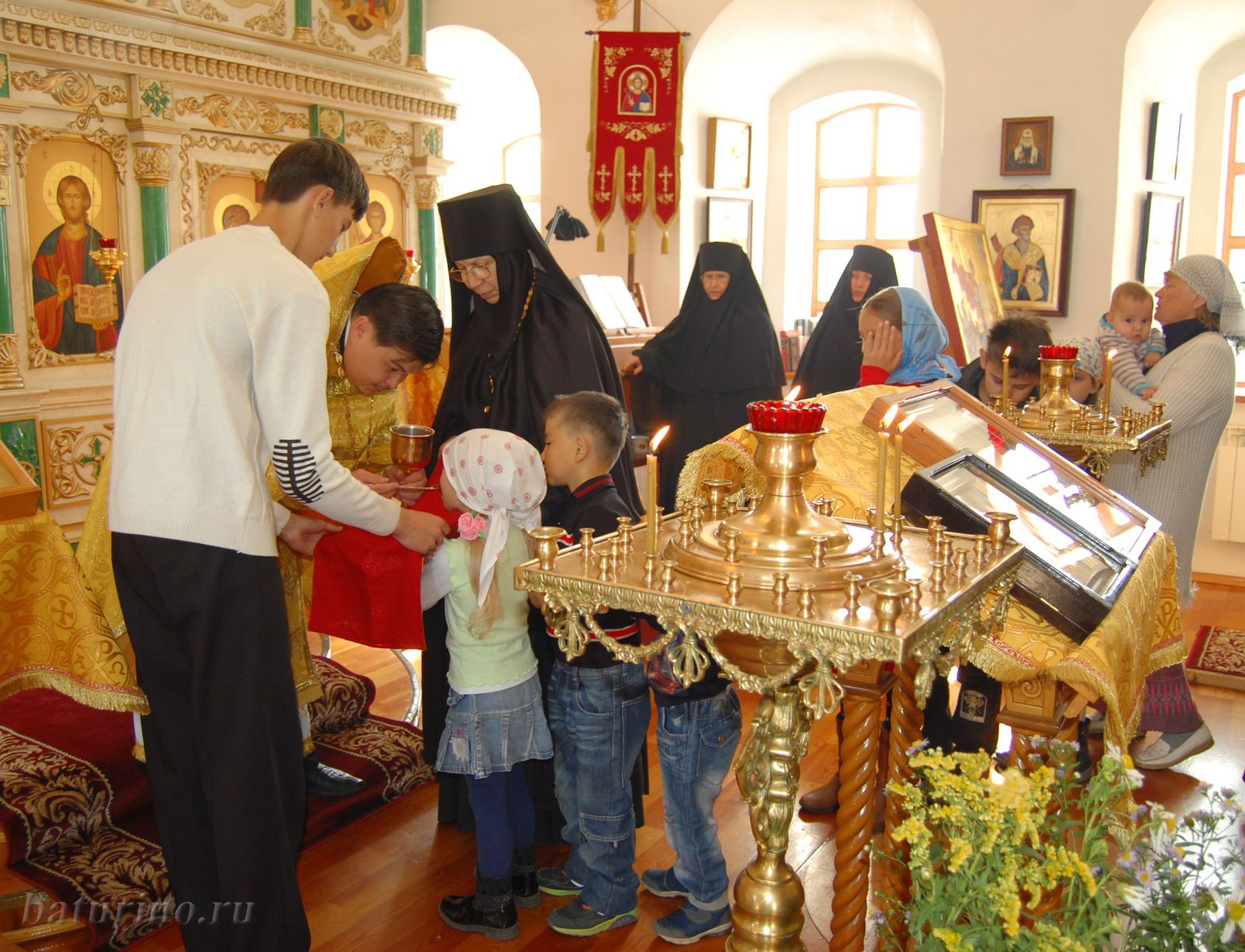 Обустраивать монашескую жизнь начали четыре девушки, которым пришлось осваивать монастырский устав одновременно с разбором груды строительного мусора. «Помню, сидим на бревне, вокруг грязь, остатки фундаментов, а так хорошо на душе…», – вспоминала впоследствии одна из монахинь. 18 декабря 2000 года в батуринской обители состоялся первый монашеский постриг. Сейчас в обители около тридцати сестер – монахини, инокини, послушницы, есть трудницы. Заведено основательное хозяйство, и помимо храмовых послушаний у насельниц много забот в трапезной, на огороде, на скотном дворе.