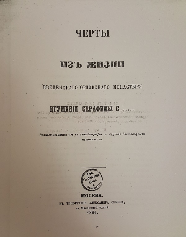 [6] Черты из жизни Введенского Орловского монастыря игумении Серафимы С…: Заимствовано из ее автобиографии и других достоверных источников. М., 1861. С. 42.