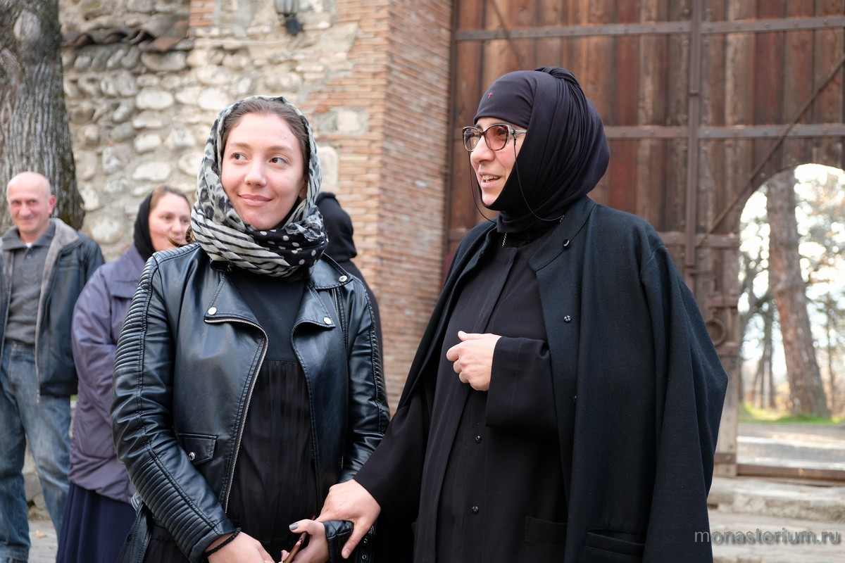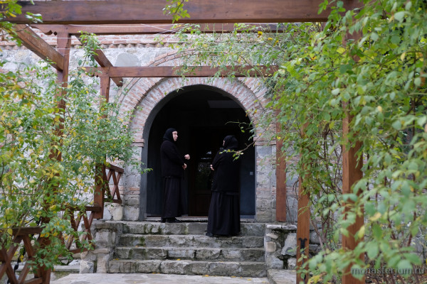 В монастыре подвизается 15 сестер, еще две сестры несут послушание в митрополии и три ­– на подворье. Таким образом монашеская семья насчитывает 20 человек. После обеда те, кто находится в обители, собираются вместе для духовного общения с матушкой-настоятельницей. Даже в Типиконе записано, что никто пусть не позволит себе в это время пропустить беседу с настоятельницей. Одна из основных тем бесед – духовная брань, происходящая с человеком на путях спасения души. Слава Богу, сейчас доступно много источников, дающих духовную пищу для обсуждения вопросов борьбы со страстями, греховными привычками и наклонностями. И в последнее время для монашествующих одним из таких источников стали выступления архипастырей и пастырей, игуменов и игумений (в том числе и гостей-святогорцев) на Международных Рождественских образовательных чтениях в Москве, в которых схиигумения Иоанна тоже принимает участие. Кстати, сестрам, знающим русский язык, она раздает тексты выступлений, звучавших на Чтениях. Тем, кто не знает, излагает их суть на грузинском. Часто пересказывает материалы из журнала «Монастырский вестник». Чувствует, что сестрам это интересно, что для них это важно. Готовясь к беседам с сестрами, матушка Иоанна также выбирает из огромного информационного потока необходимую информацию. Ведь нельзя не учитывать, что насельницы монастыря – это современные люди, вышедшие из мира с большим информационным багажом. И о событиях, происходящих в родной стране, о событиях в России им хочется знать. Обсуждается во время такого теплого, в полной мере можно сказать, семейного общения и вопрос создания небольшого монастырского музея, призванного рассказать не только об истории древней обители, но и об истории российско-грузинских отношений сквозь призму их христианского понимания. Наши страны, объединенные общей верой, пережили разные этапы этих отношений – и хорошие, и грустные, о чем, по убеждению схиигумении Иоанны, надо говорить откровенно, чтобы взгляд на историю был непредвзятым и объективным. И тогда «зомбировать» людей, манипулировать их сознанием будет сложно.