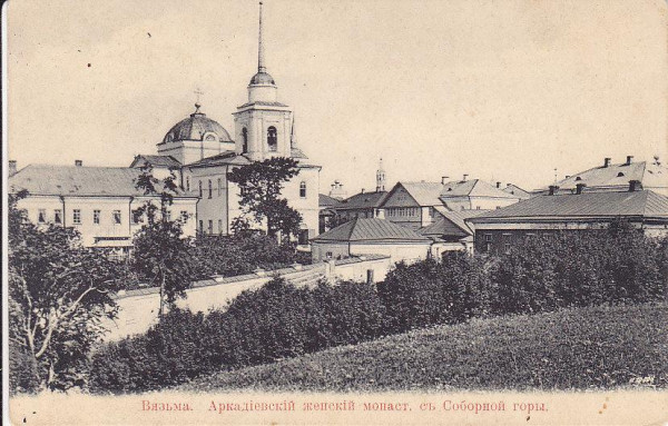 В 2017 году исполнилось 185 лет со дня открытия монастыря (открыт 1 октября (ст.ст.) 1832 года, в праздник Покрова Пресвятой Богородицы, на базе общины сестер упраздненного в 1779 году Вяземского Ильинского девичьего монастыря). В 1780 году сестрам общины было разрешено поселиться у древнего храма Всемилостевейшего Спаса, приписанного к Троицкому собору. Место расположения храма было очень живописным, на высоком холме над рекой Вязьмой. По преданию, здесь совершал свои молитвенные подвиги преподобный Аркадий Вяземский (ХI век), а впоследствии находился «нижний» Спасский монастырь. Основательницей общины была Наталья Павловна Кириллова, прожившая первую треть своей жизни в Ильинском монастыре, а затем посвятившая 68 лет жизни становлению Аркадиевского монастыря, став его первой настоятельницей. В 1833 году, в возрасте девяноста двух лет она была пострижена в монашество с именем Нимфодора и назначена настоятельницей монастыря, которым управляла до 1847 года. Умерла Матушка Нимфодора на сто девятом году жизни. По смерти первой настоятельницы в обитель была назначена игуменией казначея Вознесенского Смоленского монастыря монахиня Августа из рода князей Ширинских-Шихматовых, родная сестра иеромонаха Аникиты, основавшего церковь в честь святителя Митрофана Воронежского в русском Ильинском скиту на Святой горе Афон [21]. Иромонах Аникита (в миру князь Сергей Александрович) посещал Вяземский Аркадиевский монастырь 26–28 мая 1834 года, служил в нем всенощное бдение, Литургию, молебен преподобному Нилу Столобенскому и панихиду по своей сестре монахине Агафоклии, скончавшейся в Аркадиевском монастыре в 1833 году. Игумения Августа пожертвовала все свое имение на строительство монастыря. При ней был расширен соборный храм, к которому с севера были пристроен двухэтажный придел с престолами в честь Покрова Пресвятой Богородицы и Ахтырской иконы Божией Матери. Монастырь был обнесен каменной стеной. Игумения Августа организовала при монастыре училище для девочек.