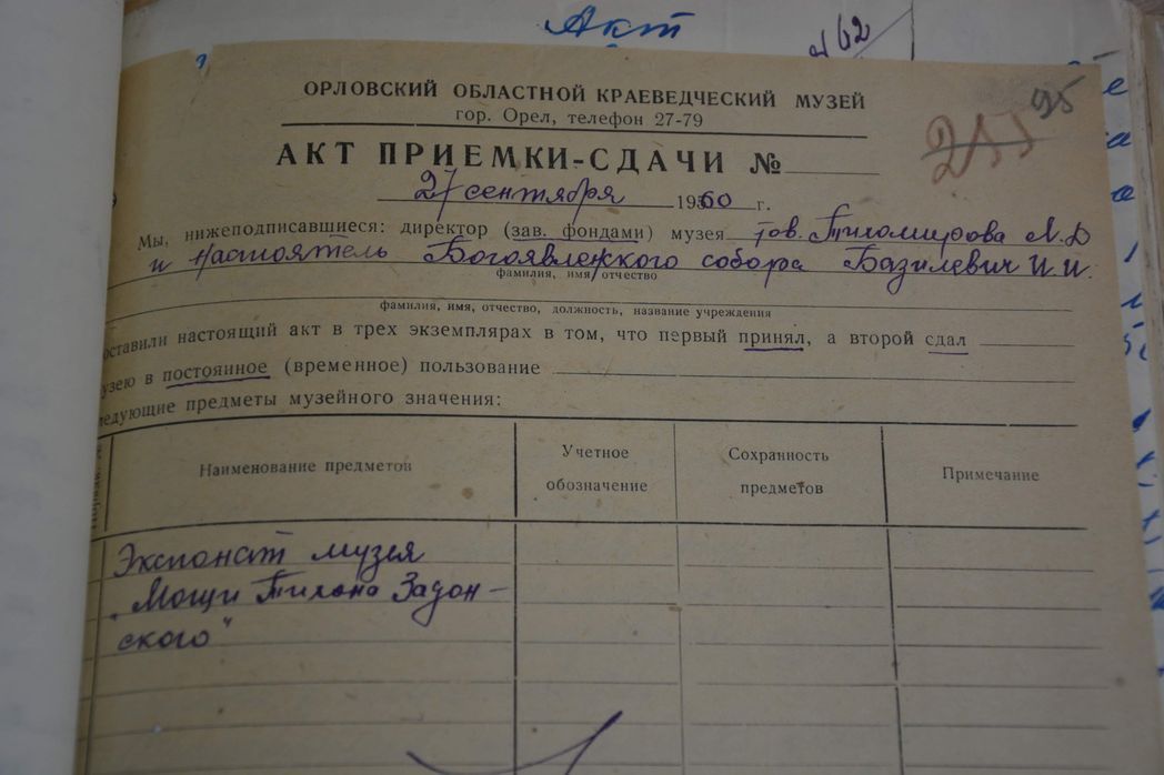 Интерес к мощам проявили работники Орловского краеведческого музея, обратившись к местным светским и церковным властям с просьбой вернуть им этот «экспонат». 23 сентября того же года Н. Зверев, исполняя распоряжение Исполкома Орловского облсовета депутатов трудящихся, передал мощи святителя Тихона директору музея «тов. Кореневой» [14]. О чём и отчитался прокурору Орловской области. В письме же Орловскому епископу Иерониму Зверев напомнил, что разрешения органов советской власти на возвращение мощей из музея в церковь не было.