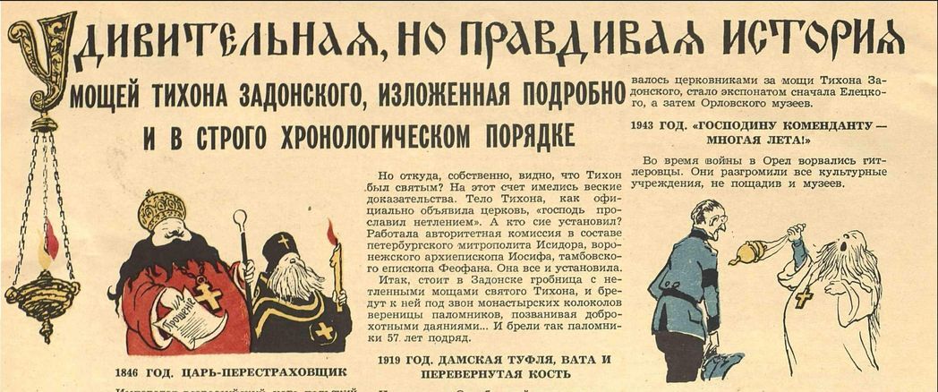 Бригада коммунистического труда завода тракторных запчастей обратилась с гневным письмом к председателю исполкома Орловского облсовета депутатов. В письме выражен протест против «новых жульнических методов церковных служителей» [10]. «Эти церковники мешают нам работать, строить коммунизм, бороться за мир, – возмущалась бригада, как один человек. – Новая возня с «нетленными» костяшками какого-то Тихона – это злобная попытка церковников дать нам, советским людям, строителям нового общества, бой… Не место этим церковным штучкам в славном, боевом городе Орле! ...Вон их из Орла и Орловщины!» [11].