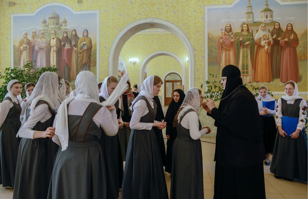 «В монастыре девочки проживают, здесь же они учатся. Учатся они бесплатно, на полном обеспечении монастыря. Питание обеспечиваем, форму шьем, и учебную, и концертную тоже, – рассказывает мать Паисия. – Практика хорового дирижирования проходит в храме. Есть череда, воспитанницы ходят на службы по очереди, а в воскресные, праздничные дни поют вместе с сестрами на два хора».