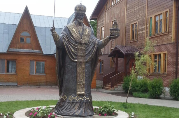 ...Хотя установка бронзового монумента святителю Николаю Чудотворцу состоялось не так давно – летом 2016 года, но представить нынче монастырь без «иконы в бронзе» (так назвал работы заслуженного художника России скульптора Сергея Михайловича Исакова Святейший Патриарх Кирилл) трудно. Кажется, что этот памятник особо близкому русской душе святому был тут изначально. Настолько органично разместился он рядом с детским корпусом, где живут 20 воспитанниц «Службы помощи семье и детям», а в считанных метрах находится деревянный Успенский храм, построенный в северных традициях современными мастерами из города Северодвинска! По рассказам настоятельницы обители игумении Неониллы (Фроловой), круг, в котором стоит святитель Николай с мечом в одной руке и храмом – в другой, был обустроен, оформлен лет 10 назад.  Одно время в нем хотели сделать сень под крестом... Потом еще что-то собирались сделать... Экскурсии приходили, люди интересовались: «Что это такое? Для чего?» А когда в монастырь пришла фотография скульптурной работы батайского мастера (Сергей Михайлович живет и работает в городе Батайске Ростовской области), сестры объездили на машине всё село: смотрели, куда можно поставить скульптуру. И в какой-то момент поняли, что именно на территории монастыря, в круге, вызывающем вопросы, ее место. Что интересно: ряд памятников святителю Николаю работы Исакова стоит по периметру российских границ, включая Курильские острова, Анадырь, Калининград, Майкоп. А памятник на Земле Франца Иосифа является самым северным памятником в мире (в 600 километрах от Северного полюса). И еще одно примечание: первым монастырем, где была установлена и освящена скульптура святителя Николая, созданная Исаковым, стал Ачаирский Крестовый женский монастырь Омской епархии. Теперь и в Никольском Шостьенском ставропигиальном женском монастыре на Рязанской земле стоит бронзовый монумент Небесному покровителю обители.