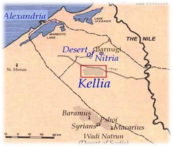 Места, которые связаны с Нитрийской пустынью, с Келлиями и Скитом,  располагаются вблизи от дельты Нила, недалеко от Александрии. В 40 километрах от Александрии находится Нитрия, примерно в 18 км – Келлии, и на расстоянии ночного перехода  (днем, как правило, не путешествовали: в пустыне легко заблудиться, поэтому путешествовали ночью по звездам, к тому же днем было жарко) находились и хижины тех, кого называли скитянами. Они жили в месте под названием Скит.