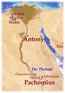 Монастыри святого Пахомия Великого находились в верхнем течении Нила. Их было 11 – девять мужских и два женских. Первым местом, где основал монастырь святой Пахомий, была Тавенниси (Тавенна), потом Боу и Хенобоскион. В Тавенниси он, собственно, подвизался и руководил этим монастырем. Второй монастырь, который в свое время стал главным, – Боу – находится рядом. Все эти места нам важно географически представить. Также мы, я думаю, должны ознакомиться с тем, как близко (или, скорее, далеко) друг от друга располагались Нитрийская пустынь и Келлии, потому что часто эти места в современном представлении путешественников и  паломников смешиваются.
