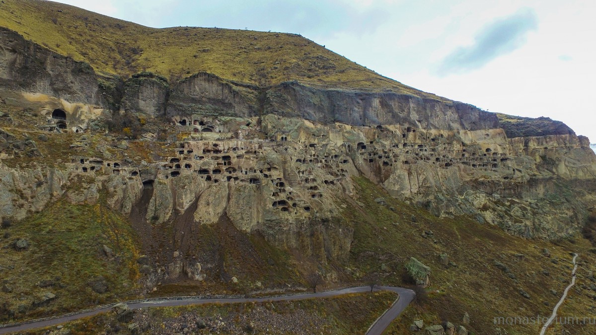 История монастыря берет свое начало в XII веке, когда грузинский царь Георгий III понял, что для защиты Грузии ему необходимо иметь на границе с Персией и Турцией хорошо укрепленную крепость. Он долго искал подходящее место, и Господь привел его к горе Эрушети (Медвежья гора). Ее отвесная стена, обращенная к долине реки Куры, была сделана из туфа (легкая и пористая горная порода – Ред.) и идеально подходила для создания подземного города. По приказу царя в Эрушети начали вырубать пещеры. Причем делали это поистине с царским размахом! Вдоль берега реки в сердце горы прорубили свыше 600 помещений, связав их между собой запутанными ходами и галереями. Из подземного города-крепости на поверхность вели лишь три скрытые от глаз входа. При необходимости долгую осаду под горой могли бы выдержать порядка 20 тысяч человек! Здесь всё было приготовлено для нормальной жизни: помещения для сна и отдыха, хранилища еды и резервуары с водой, трапезные, бани, библиотеки…