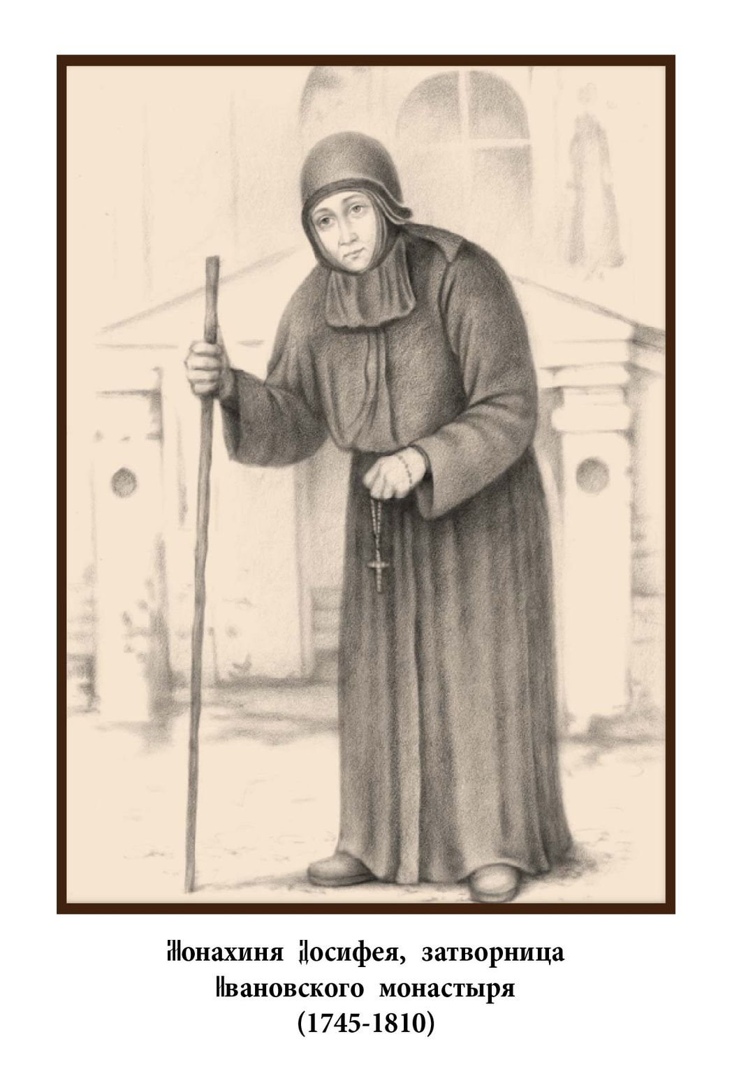 Еще один портрет ивановской подвижницы был создан нашей современницей – художницей Риммой Шевяковой в технике «сухая кисть». Старица Досифея изображена во весь рост, она как будто вышла из своего затвора и идет навстречу нам. «Согбенная и одновременно величественная, матушка с посохом в руке тихо идет по дорожке возле храма. Встретив посетителей, приостановилась, приветствуя их с готовностью выслушать и помочь. Лик старицы, преображенный непрестанной молитвой, излучает свет. Внимательный и исполненный доброты взгляд, приветливая полуулыбка внушают глубокое почтение и доверительную сердечную расположенность» [10].