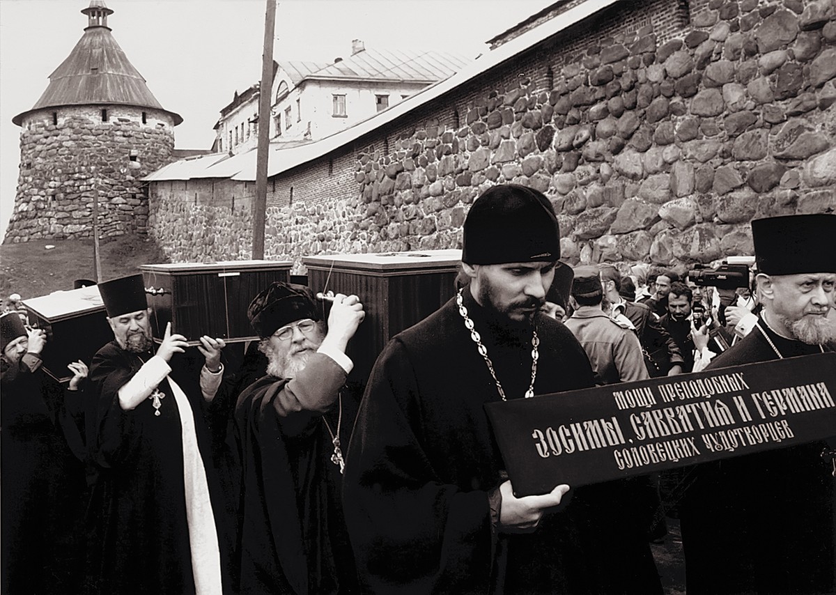 21 августа 1992 года ряды крестного хода пополнили сотни людей – столько верующих прибыло с материка на Соловки! В документальном фильме «Архимандрит Иосиф. Соловецкая быль», представленном на кинофестивале «Радонеж» в 2015 году, батюшка рассказывает: когда стало известно, что святые мощи Первоначальников Соловецких находятся в городе на Неве, их надо перевезти (а денег-то не было и никого из знакомых у него в Питере не было), он стал собирать средства в Москве. Многие москвичи-жертвователи тоже захотели приехать на этот незабываемый праздник. Пришлось фрахтовать самолет «Москва-Санкт-Петербург», «Санкт-Петербург-Архангельск» и морские суда из Архангельска на Соловки, хотя поначалу препятствия казались непреодолимыми. Но… «Господь дал всё – и средства, и людей», – улыбается со слезами на глазах пастырь. И что особенно памятно, духоподъемно – сопровождал святые мощи великих угодников Божиих Святейший Патриарх Алексий II с архипастырями и духовенством. Священноархимандрит Спасо-Преображенского Соловецкого ставропигиального мужского монастыря Патриарх Алексий впервые ступил на соловецкую землю, политую кровью мучеников и исповедников российских и возглавил великое торжество. Документально подтверждено, что до 1939 года мощи преподобных Зосимы, Савватия и Германа оставались на Соловках в краеведческом музее, находившемся в подчинении начальства Соловецкого лагеря особого назначения (СЛОН). После ликвидации лагеря, названного Александром Солженицыным «полярным Освенцимом», их вывезли на материк и передали на хранение в Центральный антирелигиозный музей в Москве, затем – в Ленинградский музей истории религии и атеизма. И вот они снова в родной обители – честные мощи трех подвижников XV века, выбравших безлюдный дикий край для аскетических подвигов. Снова на месте – главная святыня древнего намоленного монастыря, который должен был подняться из разрухи, по словам Его Святейшества, «…после 70-летнего богоборческого пленения».