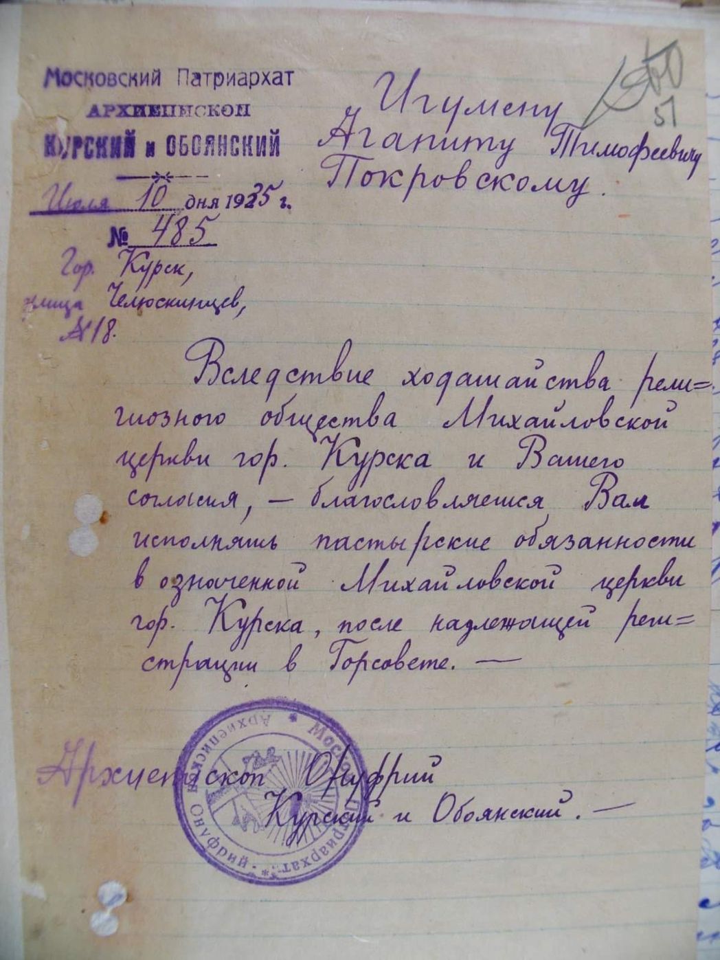 В церковной сторожке при курском Троицком храме жили две женщины, которых свидетель назвал монашками: Екатерина Ивановна Бутилова и Дарья Марковна Сергеева. В Николаевском храме Стрелецкой слободы Курска служил иеродиакон Иероним (Костюченко). В село Крупец архиепископ Онуфрий назначал иеромонаха Евдокима (Свиридова), вернувшегося из заключения. 10 июля 1935 года владыка назначил в Михайловский храм Курска игумена Агапита (Покровского). Это было одно из последних его распоряжений, сделанных в качестве управляющего Курской епархией. Через 13 дней священномученика Онуфрия арестовали. Игумена Агапита арестовали через два с половиной года и расстреляли в Курске в 1938 году.
