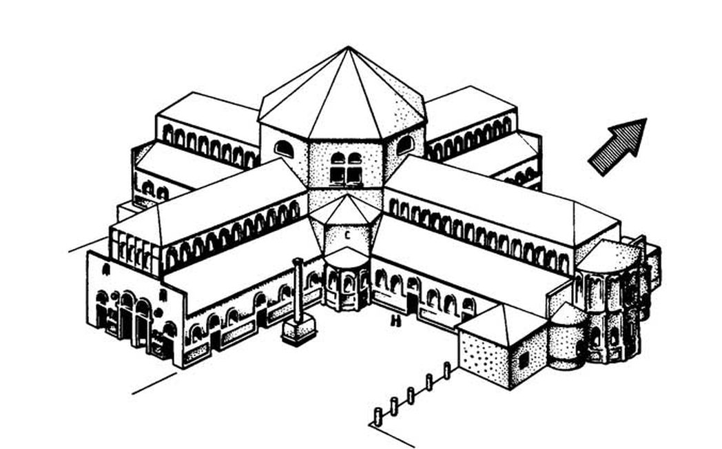 Четыре храма, образуя стороны креста, были построены по базиликальному типу. Каждый имел вид большого портика, разделенного арками на три части. Таким образом, собор включает в себя одновременно восьмиугольник и крест. У северной стены главного восточного храма находится древнее захоронение монахов, относимое к концу V века. Это склеп, выбитый в скале, и в нем покоятся кости усопших монахов. В стене северного храма есть еще одно монашеское захоронение. С восточной и южной стороны монастыря находились прямоугольные дворы. Там расположены трехэтажные здания, в которых размещались в древности конюшни, а некоторые здания были достроены в средние века. Келейные корпуса монахов располагались с восточной стороны монастыря, а к юго-востоку от главного храма находился небольшой монастырский храм, где совершалась ежедневная молитва насельников. В его юго-западном углу во время раскопок была найдена апсида. Большой камень с красивым декором, возможно, служил покрытием детской крещальной купели. Также были обнаружены прессы для изготовления вина или оливкового масла.