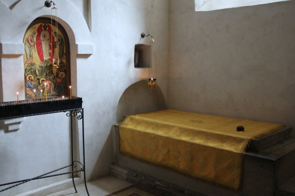 Шел VI век от Рождества Христова. К подножию горы на северо-западе Иерусалима (с эпохи Крестовых походов она будет известна как Гора Радости) приблизились несколько иноков, проделавших трудный путь из далекой земли, именуемой Сакартвело, или Иверия. Старец, возглавлявший паломников, вдруг сказал своим спутникам: «Я, грешный, не посмею ходить по земле, где ступали ноги Господа». Отпустив учеников, он не пошел дальше, а когда пришла пора отправляться обратно, подобрал с земли три простых камня, в душе веруя, что взял их как бы с могилы Христа. В это время Иерусалимскому патриарху во сне предстал Ангел и сказал, что один из паломников «верой своей унес всю благодать из Иерусалима». Патриаршие скороходы нагнали монахов и забрали два камня, а один оставили, передав старцу слова патриарха: «Одну часть дарую тебе для твоей пустыни, забери этот камень как благодать, на память и для напоминания о твоей вере».