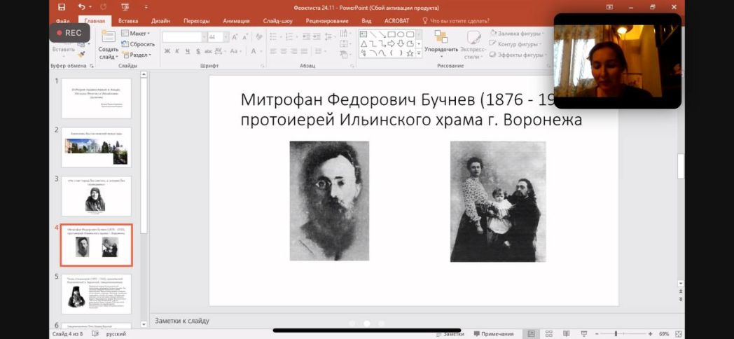 Особой искренностью был отмечен доклад Анастасии Петровны Терских, доцента Воронежского государственного медицинского университета им. Н.Н. Бурденко, и Татьяны Николаевны Жиляевой, педагога-психолога лицея села Верхний Мамон: «История в лицах. Матушка Феоктиста Михайловна Шульгина». Из содержательного и объемного рассказа о подвижнической жизни блаженной Феоктисты († 1940) особо запомнились два момента: в исторических документах указывается, как однажды матушка Феоктиста попросила протоиерея Митрофана Бучнева (отец Митрофан благоговел перед матушкой и считал себя послушником Феоктисты Михайловны) купить ей, а потом и надеть на нее новые ботинки. Невзирая на недоумение горожан по поводу такой просьбы, отец Митрофан встал на колени и обул матушку, сказав при этом: «Эта раба Божия в меру Антония Великого, я бы рад был день и ночь пребывать у ее ног». Когда протоиерея Митрофана отправляли в ссылку, из которой он уже не вернулся, сформировавшуюся вокруг него общину, подобную московской общине святого праведного Алексия и священномученика Сергия Мечевых, он передал под покров матушки Феоктисты, что говорит о ее духовной мудрости и глубокой монашеской опытности.
