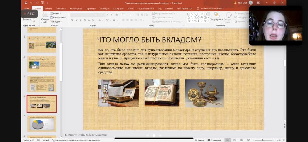 В авангард по сохранению исторической памяти Феодоровский монастырь привлек не только именитых представителей научного сообщества, но и молодых ученых. Хирова Анна Ивановна, составитель образовательного контента информационно-образовательных ресурсов на портале Библиотека информационно-образовательных ресурсов «Умней» (г. Химки), соискатель Историко-архивного института РГГУ, выступила с докладом на тему: «Значение вкладов в поминальной культуре как части православной мемориальной традиции (по материалам вкладной книги и синодика Феодоровского монастыря г. Переславля-Залесского XVI – XVIII вв.)». Анна Ивановна проделала большую работу по изучению истории Феодоровского женского монастыря и выиграла в 2020 году грант на конкурсе проектов молодых ученых по истории Русской Православной Церкви.