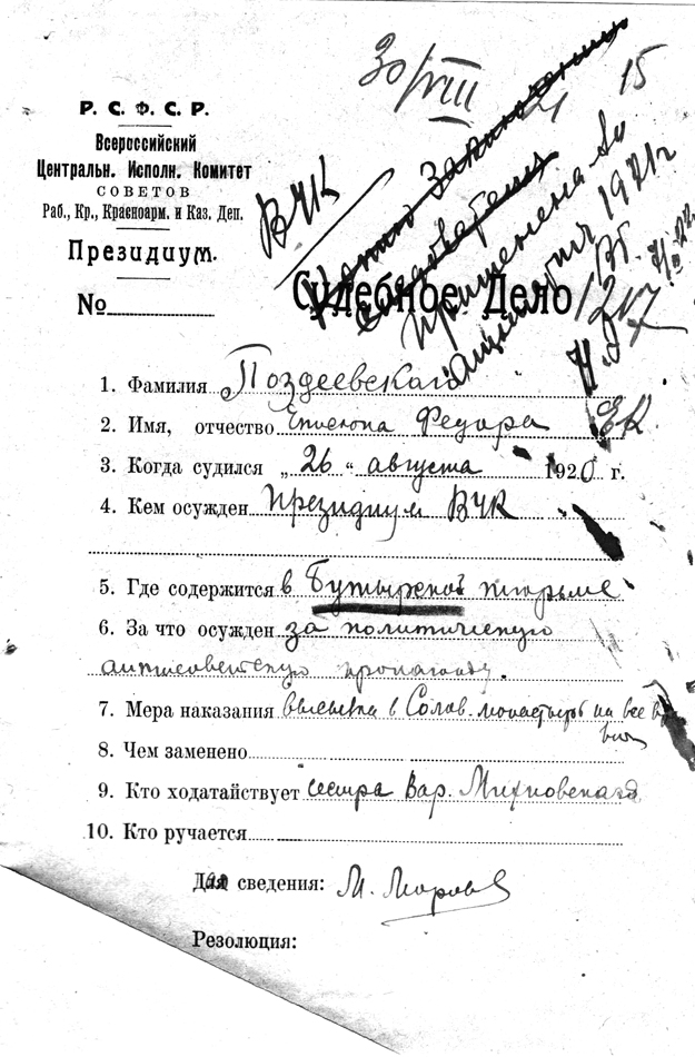 4 марта 1922 г. Президиум ВЦИК рассмотрел «ходатайство о помиловании епископов Поздеевского и Степанова, осужденных ВЧК», и постановил освободить их от наказания. Но уже 5 марта «Президиум ВЦИК во изменение своего постановления от 24/III-22 г. (так в деле. – Т.П.) постановил епископа Феодора Поздеевского и Степанова А.И. освободить по изъятии церковных ценностей».