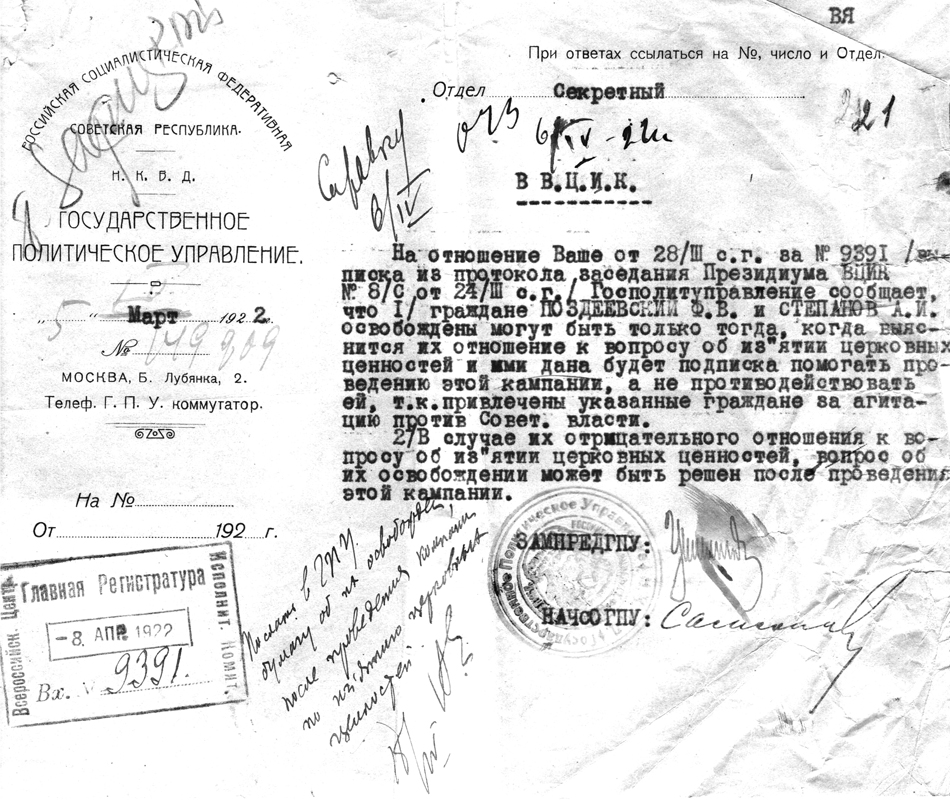 Но на этом дело не кончилось. Бдительные чекисты решили не торопиться с освобождением и так неизвестно за что, даже по их меркам, отсидевших в тюрьме почти 2 года епископов и выставить дополнительные условия их освобождения: Секретный отдел ГПУ НКВД решил, «что 1/ гр. ПОЗДЕЕВСКИЙ Ф.В. и СТЕПАНОВ А.И. освобождены могут быть только тогда, когда выяснится их отношение к вопросу об изъятии церковных ценностей и ими дана будет подписка помогать ведению этой кампании, а не противодействовать ей... 2/ В случае их отрицательного отношения к вопросу об изъятии церковных ценностей вопрос об их освобождении может быть решен после проведения этой кампании».